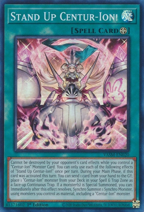 Cannot be destroyed by your opponent's card effects while you control a "Centur-Ion" Monster Card. You can only use each of the following effects of "Stand Up Centur-Ion!" once per turn. During your Main Phase, if this card was activated this turn: You can send 1 card from your hand to the GY; place 1 "Centur-Ion" monster from your Deck in your Spell & Trap Zone as a face-up Continuous Trap. If a monster(s) is Special Summoned, you can: Immediately after this effect resolves, Synchro Summon 1 Synchro Monster, using monsters you control as material, including a "Centur-Ion" monster.
