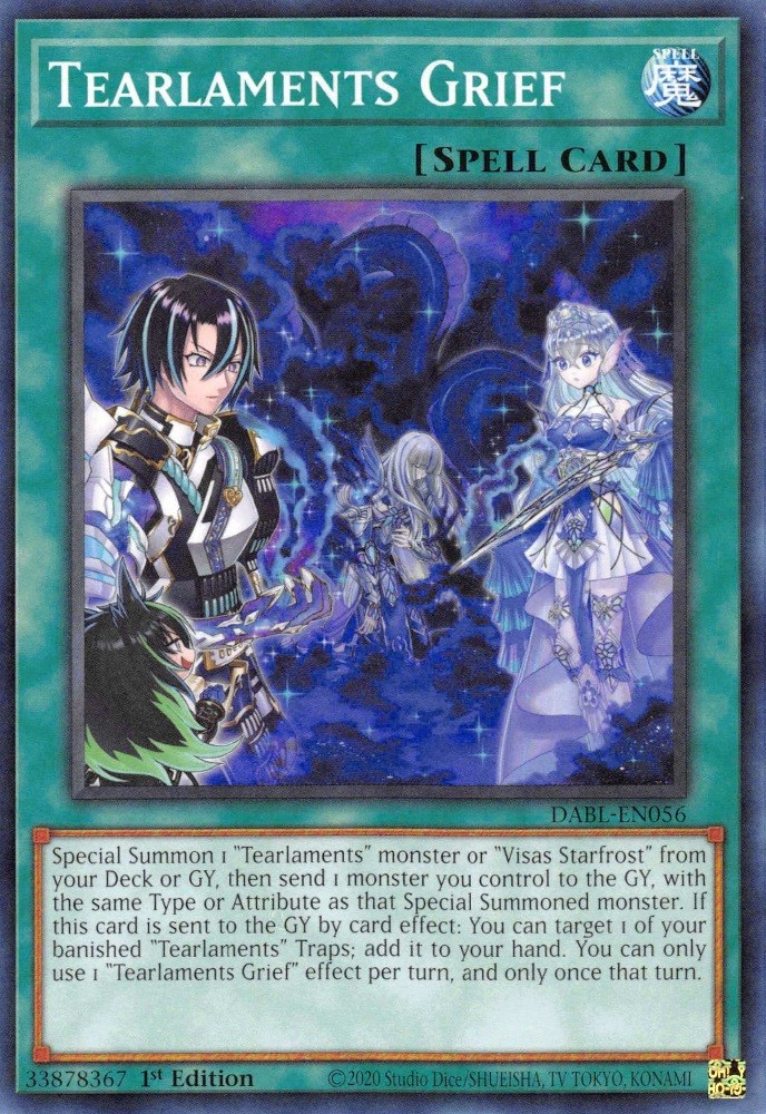 Special Summon 1 "Tearlaments" monster or "Visas Starfrost" from your Deck or GY, then send 1 monster you control to the GY, with the same Type or Attribute as that Special Summoned monster. If this card is sent to the GY by card effect: You can target 1 of your banished "Tearlaments" Traps; add it to your hand. You can only use 1 "Tearlaments Grief" effect per turn, and only once that turn.