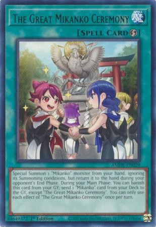 Special Summon 1 "Mikanko" monster from your hand, ignoring its Summoning conditions, but return it to the hand during your opponent's End Phase. During your Main Phase: You can banish this card from your GY; send 1 "Mikanko" card from your Deck to the GY, except "The Great Mikanko Ceremony". You can only use each effect of "The Great Mikanko Ceremony" once per turn.