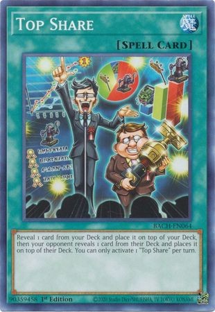 Reveal 1 card from your Deck and place it on top of your Deck, then your opponent reveals 1 card from their Deck and places it on top of their Deck. You can only activate 1 "Top Share" per turn.
