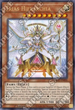 During the Main Phase, if this card is in your hand or GY (Quick Effect): You can Tribute up to 3 Fairy monsters; Special Summon this card (but banish it when it leaves the field), then, you can apply the following effect(s) in sequence, depending on the number of Tributed monsters. ● 2+: Destroy 1 card your opponent controls. ● 3: Draw 2 cards. You can only use this effect of "Trias Hierarchia" once per turn.