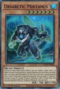 During the Main Phase (Quick Effect): You can Tribute 1 other Level 7 or higher monster from your hand; Special Summon this card from your hand, also you cannot Special Summon for the rest of this turn, except monsters with a Level. If this card is Special Summoned: You can target 1 "Ursarctic" monster in your GY, except "Ursarctic Miktanus"; add it to your hand. You can only use each effect of "Ursarctic Miktanus" once per turn.
