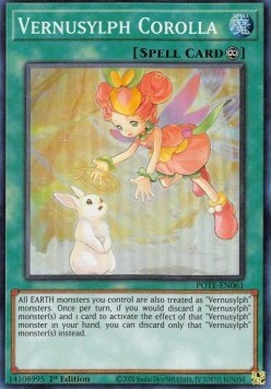 All EARTH monsters you control are also treated as "Vernusylph" monsters. Once per turn, if you would discard a "Vernusylph" monster(s) and 1 card to activate the effect of that "Vernusylph" monster in your hand, you can discard only that "Vernusylph" monster(s) instead.