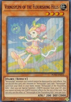 "Vernusylph" monsters you control cannot be destroyed by card effects. You can discard this card, and 1 monster or "Vernusylph" card; add 1 "Vernusylph" card from your Deck to your hand, except "Vernusylph of the Flourishing Hills", then you can Special Summon 1 EARTH monster from your GY, also you cannot activate non-EARTH monster effects for the rest of this turn. You can only use this effect of "Vernusylph of the Flourishing Hills" once per turn.