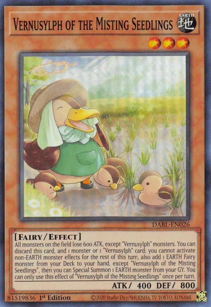 All monsters on the field lose 600 ATK, except "Vernusylph" monsters. You can discard this card, and 1 monster or 1 "Vernusylph" card; you cannot activate non-EARTH monster effects for the rest of this turn, also add 1 EARTH Fairy monster from your Deck to your hand, except "Vernusylph of the Misting Seedlings", then you can Special Summon 1 EARTH monster from your GY. You can only use this effect of "Vernusylph of the Misting Seedlings" once per turn.