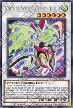 1 Tuner + 1+ non-Tuner monsters Cannot be destroyed by battle or card effects while you have 2 or more monsters in your GY with the same original Type and Attribute, but different names. You can banish 2 monsters from your GY with the same original Type and Attribute, but different names, then target 1 card on the field; send it to the GY. You can only use this effect of "Virtual World Beast - Jiujiu" once per turn.