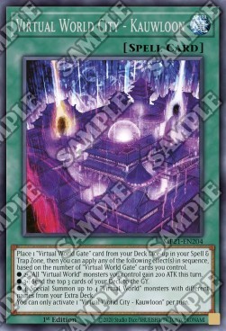 Place 1 "Virtual World Gate" card from your Deck face-up in your Spell & Trap Zone, then you can apply any of the following effect(s) in sequence, based on the number of "Virtual World Gate" cards you control. ● 2+: All "Virtual World" monsters you control gain 200 ATK this turn. ● 3+: Send the top 3 cards of your Deck to the GY. ● 4: Special Summon up to 4 "Virtual World" monsters with different names from your Extra Deck. You can only activate 1 "Virtual World City - Kauwloon" per turn.