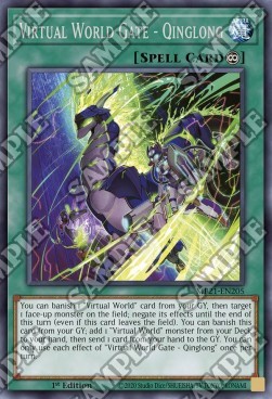 You can banish 1 "Virtual World" card from your GY, then target 1 face-up monster on the field; negate its effects until the end of this turn (even if this card leaves the field). You can banish this card from your GY; add 1 "Virtual World" monster from your Deck to your hand, then send 1 card from your hand to the GY. You can only use each effect of "Virtual World Gate - Qinglong" once per turn.