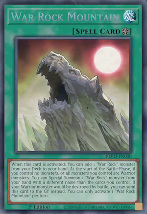 When this card is activated: You can add 1 "War Rock" monster from your Deck to your hand. At the start of the Battle Phase, if you control no monsters, or all monsters you control are Warrior monsters: You can Special Summon 1 "War Rock" monster from your hand with a different name than the cards you control. If your Warrior monster would be destroyed by battle, you can send this card to the GY instead. You can only activate 1 "War Rock Mountain" per turn.