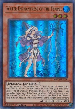 If you control an "Adventurer Token": You can Special Summon this card from your hand. You can banish this card from your hand or GY; add 1 "Rite of Aramesir" from your Deck or GY to your hand. If you control an "Adventurer Token": You can place 1 Field Spell that mentions "Adventurer Token" from your Deck face-up in your Field Zone. You can only use each effect of "Water Enchantress of the Temple" once per turn.