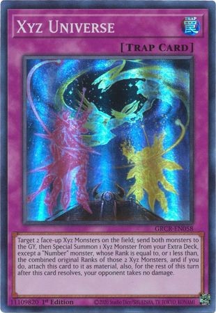 Target 2 face-up Xyz Monsters on the field; send both monsters to the Graveyard, then Special Summon 1 Xyz Monster from your Extra Deck, except a "Number" monster, whose Rank is equal to, or 1 less than, the combined original Ranks of those 2 Xyz Monsters, and if you do, attach this card to it as an Xyz Material. If you activated this card, your opponent takes no further damage this turn.